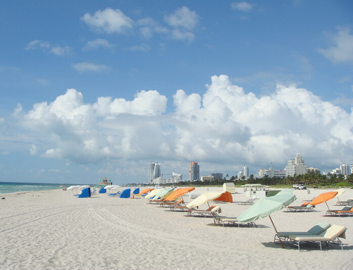 迈阿密海滩是美国著名的海水浴场,也是全世界名列前茅的观光胜地,它位于迈阿密的海滩市,与迈阿密隔着比斯坎海湾相望,有几座跨海大桥与之相连。这个海滩海水浅,浪小涌平,沙细沙白,平坦广阔,延绵数公里,像一条长长的宽大白色玉带镶在海边,一眼望不到头。蓝天、碧海、白沙,加上一群群海鸥时而在海上戏水,时而到沙滩觅食,时而又翱翔天空,组成了一幅十分美妙的立体图画,每年有数百万人来这里享受沙滩阳光和海水带来的舒畅。