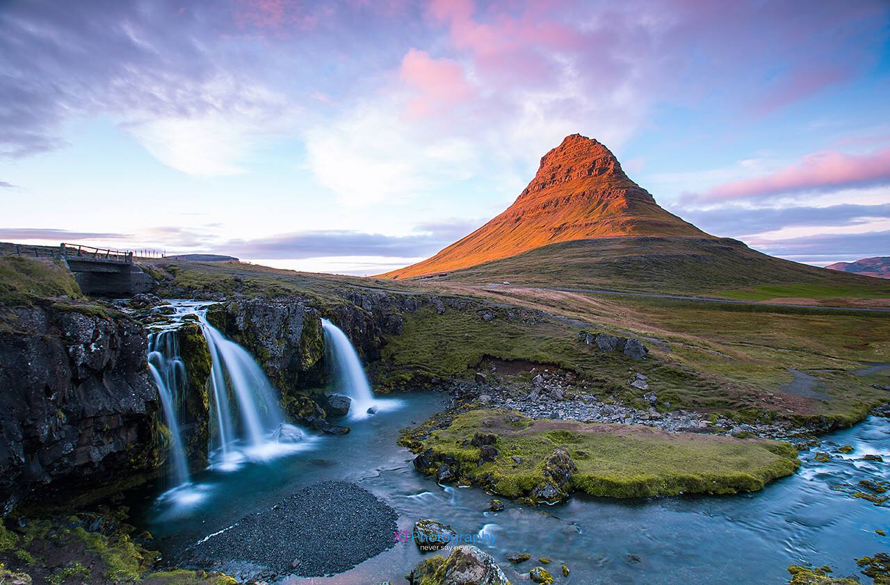 冰岛草帽山(Kirkjufell)位于冰岛Grundarfjordur小镇附近,坐落于斯奈山半岛(Snaefellsnes)。它的名字翻译成英文是'ChurchMountain',(教会山)也许是它的外形让人们联想起教堂塔。Kirkjufell基尔丘山是一个有着美丽外形和匀称的独立山体,也有人说它是草帽山,因为有的角度看它就像是一顶草帽,所以Kirkjufell也叫草帽山,教会山。