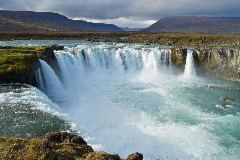 冰岛上帝瀑布(Godafoss),世间少有的马蹄形瀑布。它有着非常壮观而迷人的弧形,也被称作“神之瀑布”、“众神瀑布”。是难得一见的轴对称双瀑布。位于冰岛环岛1号公路边上,被称为“路边的珍珠”。高12米,宽30米。传说公元1000年,冰岛皈依基督教时,北欧众神雕像被遗弃在这里,故而得名。