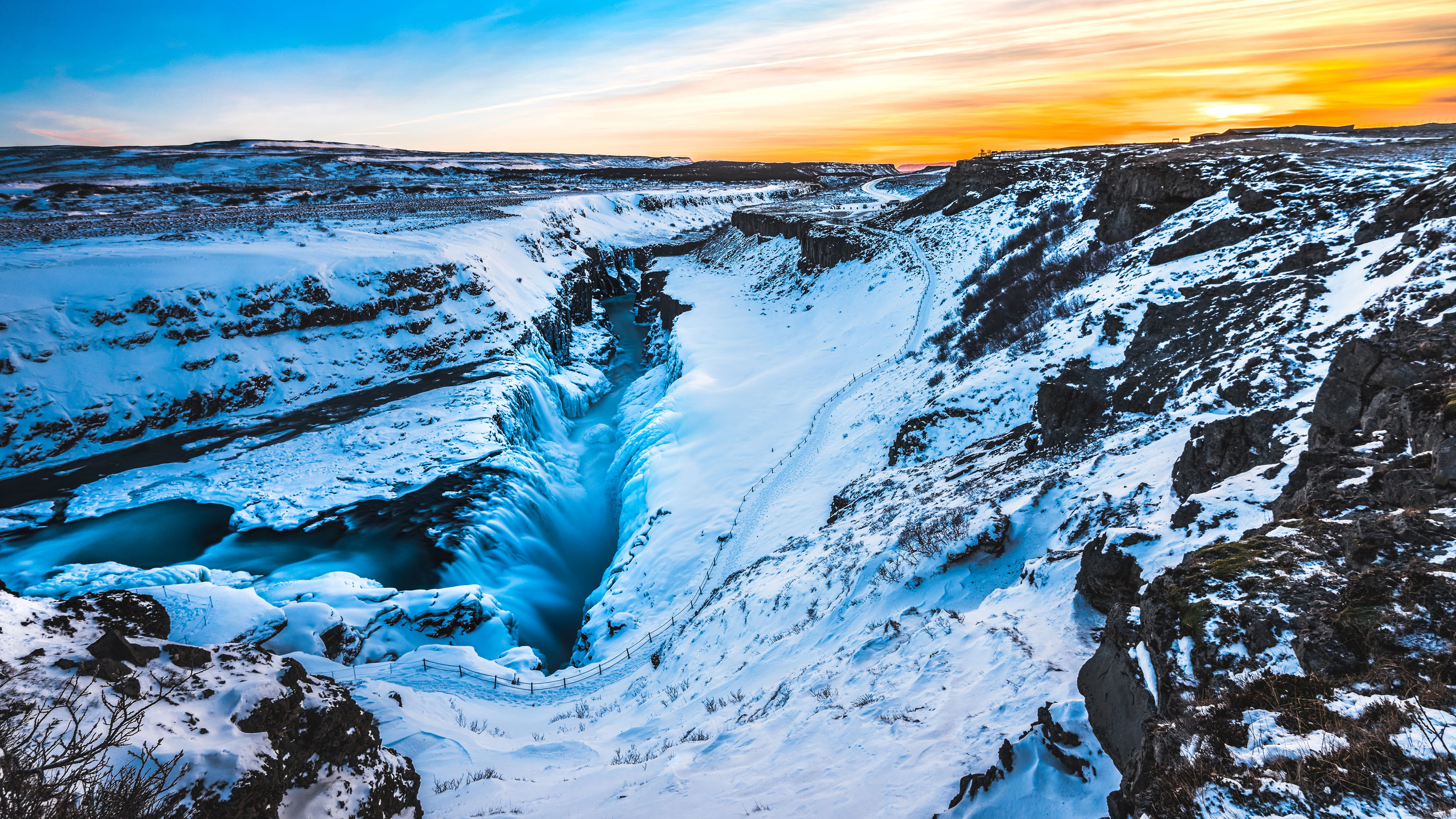 冰岛黄金瀑布在哥吉尔喷泉北面十公里处,是冰岛人最喜爱的瀑布,也是欧洲著名的瀑布之一,倾泻而下的瀑布溅出的水珠弥漫在天空,在阳光照射下形成道道彩虹,仿佛整个瀑布是用金子锻造成的,景象瑰丽无比,令游客流连忘返。