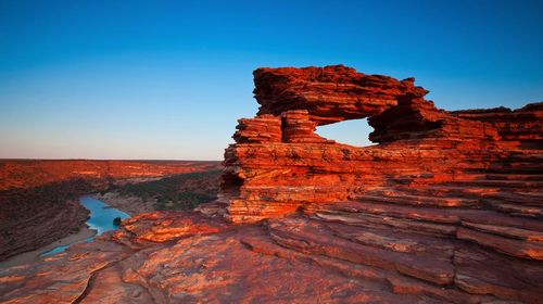 超过18万公顷的内陆冒险乐园里,奇诡险峻的峡谷、灿烂的野花和标志性的奇特景点自然之窗(Nature’sWindow)让卡尔巴里国家公园成为了西澳盛名远扬的经典必备游览胜地。去丛林里、峡谷间徒步,或者到穆尔其森河(MurchisonRiver)上划独木舟,开启一场4亿年的时光之旅,那时古老海洋的滩涂形成了如今醒目的锈红色砂岩,自然的力量雕刻出了深邃、奇诡的海岸线。