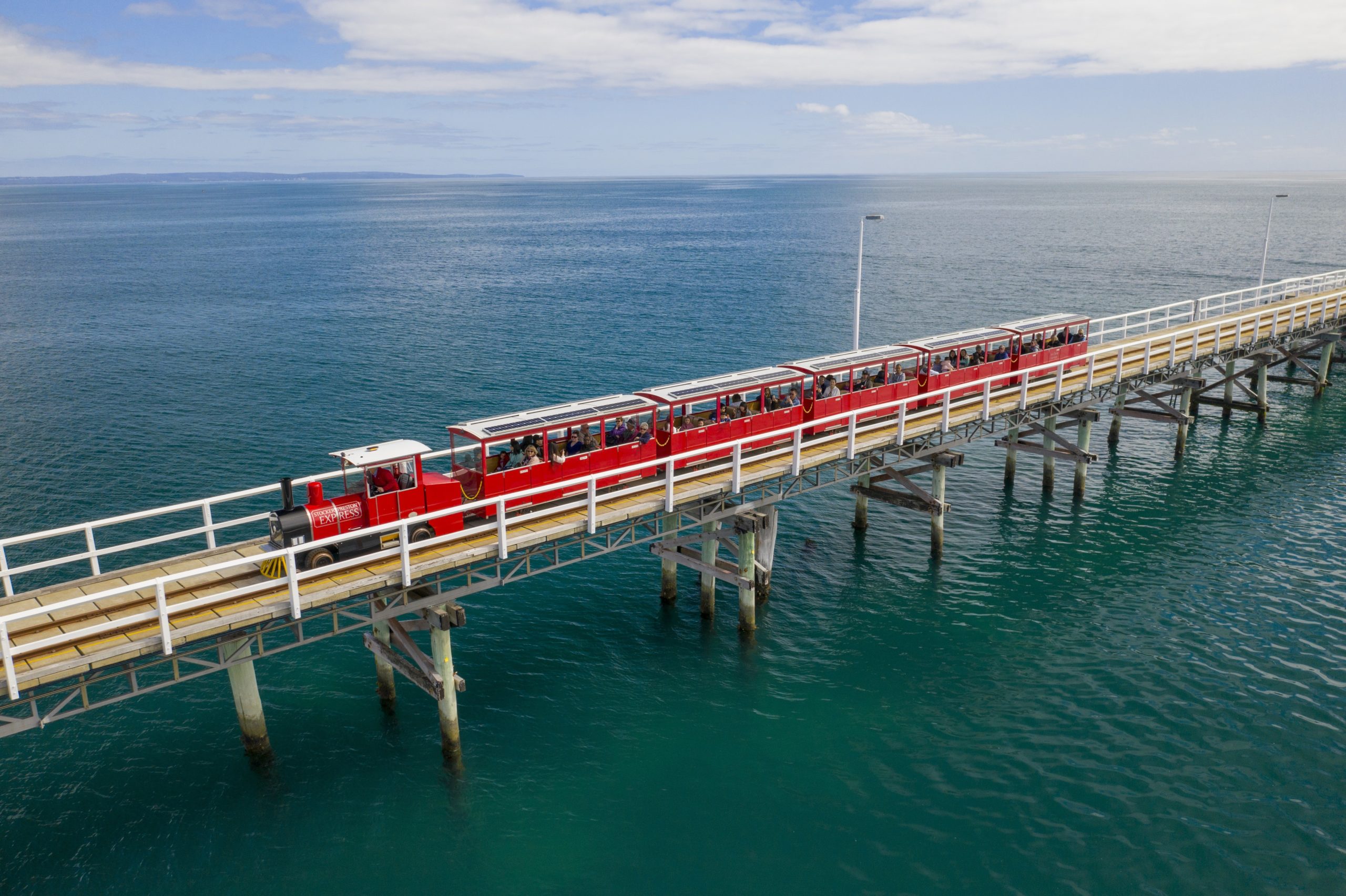 巴瑟尔顿栈桥(BusseltonJetty)---乘坐童话中的红色小火车游览南半球最长的木质栈桥。位于珀斯市南220公里2小时40分钟路程处。该栈桥于1865年开始修建基础,直到1960年建成了这座延伸向大海深处达1939米的栈桥。桥上有小火车供游人乘坐,桥的尽头还建有一个地下水族馆。栈桥入口位于主游泳海滩,步行片刻即可到达巴瑟尔顿高街