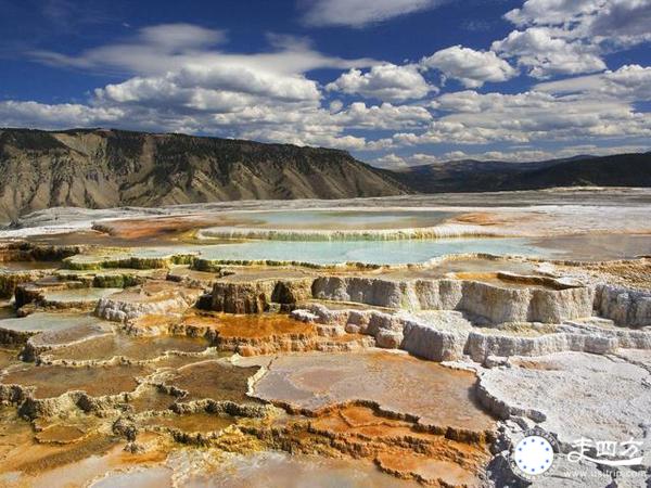 位于美国黄石公园的猛犸温泉(Mammoth Hot Springs),是世界上已探明的最大的碳酸盐沉积温泉,它最显著的特点当属米涅瓦阶地,那是几千年来冷却沉淀的温泉水所形成的一连串阶地。阶地呈现出不同的形状,是由于当年大大小小的地震造成的,大小不一,形状各异,非常壮观。