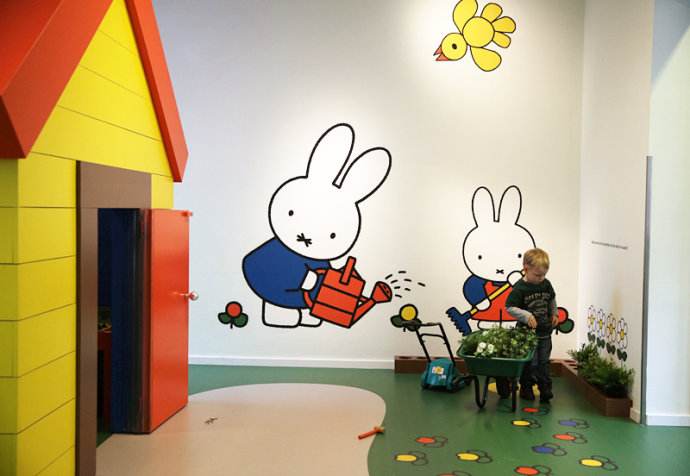 米菲兔博物馆位于荷兰乌特勒支市,中央博物馆附近,展示厅里总共分为两层,第一间小房间里墙上贴满了世界各国出版的Miffy有声书的版本,也可以坐下来听听不同语言的有声书;接下来的房间里则展示着一些DickBruna的创作,墙上也陈列着一些DickBruna从小到大的照片,以及Miffy的小小简介。