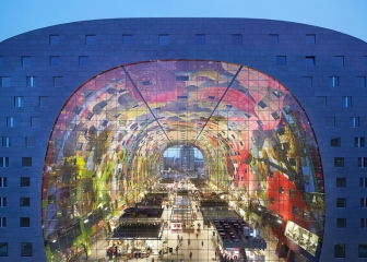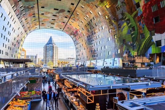 鹿特丹的Markthal大型拱廊市场于2014年开门迎客,是荷兰的第一座室内新鲜食品市场。极具创意的弧形隧道结构建筑包括隧道形状市场大厅、228套带阳台的公寓、3000平方米的零售区域、位于底层的1600平米餐饮区、二楼1800平方米的超市,吸引无数吃货和游客。该建筑最抢眼的地方在于其炫丽的内部艺术装饰—名为“富饶之角”的巨型数码壁画面积达3335平方米,画满昆虫鱼鸟花卉,充满童话色彩。Markthal菜市场的商铺里有关于美食的一切:原料、佐料、加工副食品、餐饮、厨具…应有尽有。内容也包罗万象,从荷兰奶酪、意大利冰激凌、日本寿司、到中国超市,满足全世界人民的喜好。商铺顶上是休闲露台,可以静享一杯咖啡美酒,小坐歇息。这里每周七天开业,早10点到晚8点,酒吧餐厅的关门时间会更晚。在几乎所有商铺都在晚6点关门的荷兰,markthal菜市场绝对算个特例了。