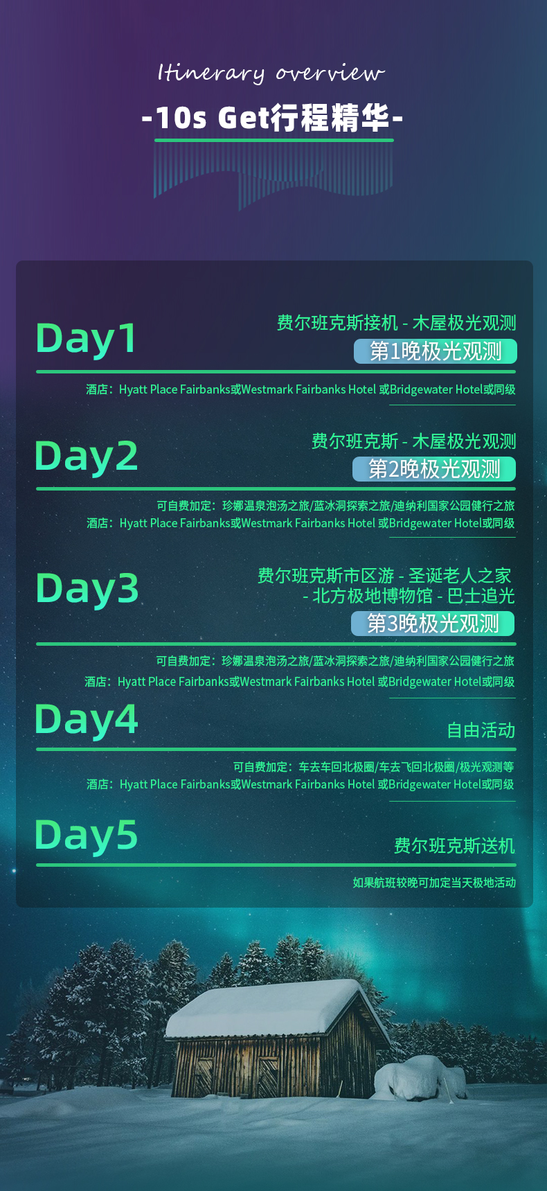 | 北极光观测木屋 (选付) | 每人: $120 | 2人起成行 |