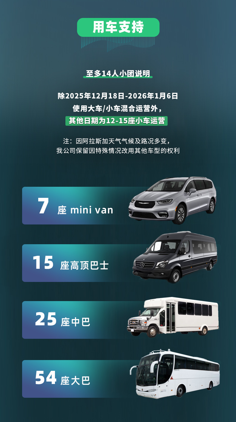 14人小团特别说明:圣诞旺季2025年12月18日 – 2026年1月6日期间大车/小车混合使用,其他日期为12-15座小车,每车最多14位客人。*因阿拉斯加天气气候及路况多变,公司保留因特殊情况改用其他车型的权利。