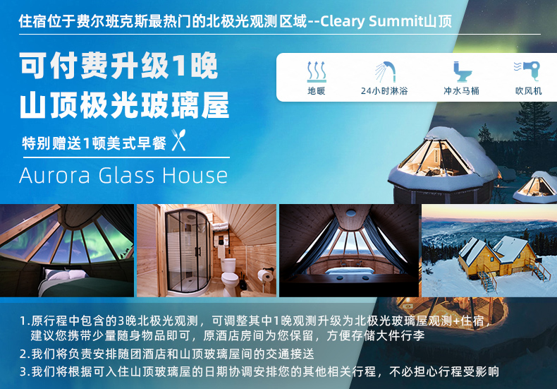 - 如果购买22点及之后抵达航班默认放弃第1晚极光观测(不退不补),请自行前往酒店