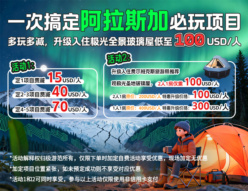 | 卡斯特纳蓝冰洞Castner Glacier Ice Cave探索之旅 (选付) | 每人: $300 | 仅限抵达后团上报名,预计开放日期:12月下旬-3月 |