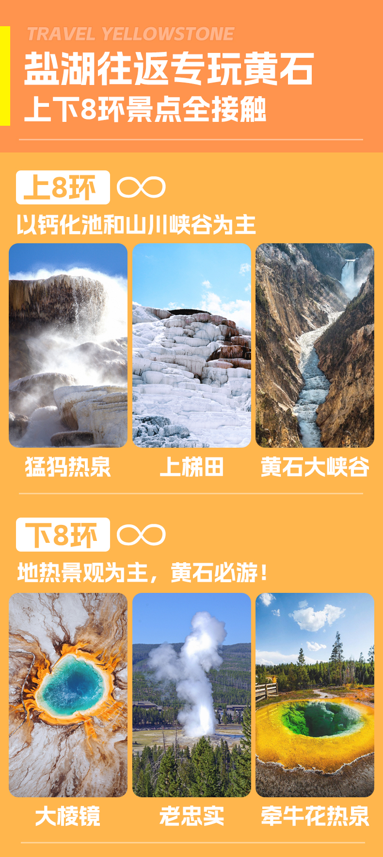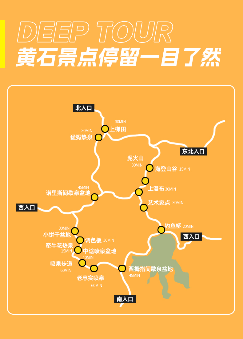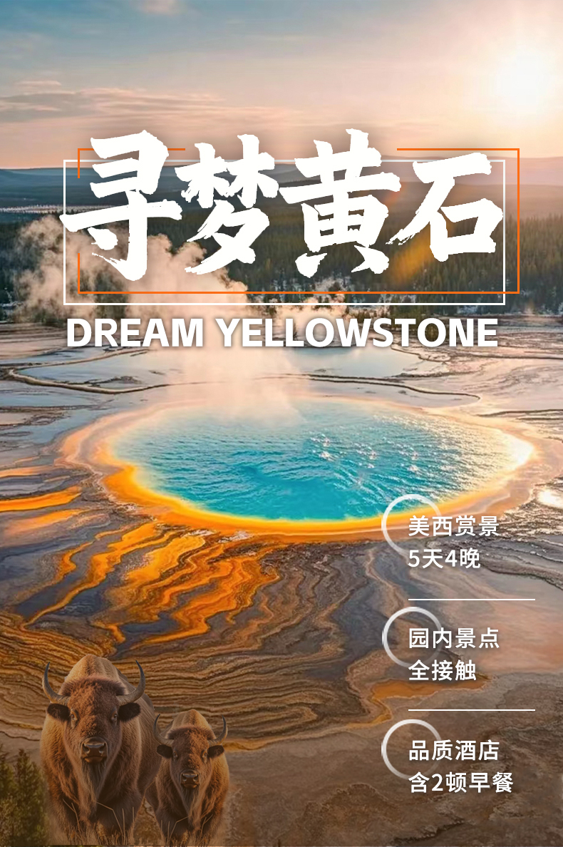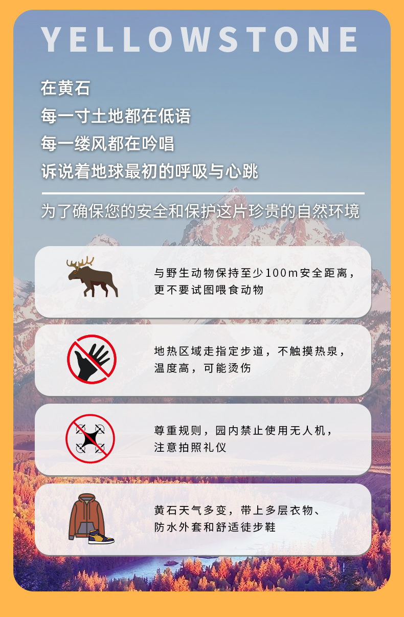 2. 黄石国家公园南门预计将于05/10/2026开放,因此05/02/2026-05/09/2026期间西拇指间歇泉仍无法参观游览,敬请谅解。
