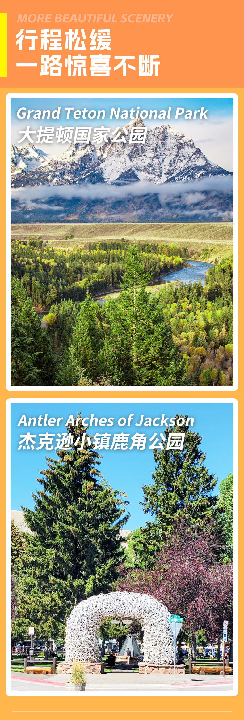 盐湖城 → 杰克逊 → 鹿角公园(60分钟)→ 大提顿国家公园(必付项目,60分钟)→ 黄石国家公园(必付项目,40分钟,停留西拇指间歇泉盆地)→ 西黄石