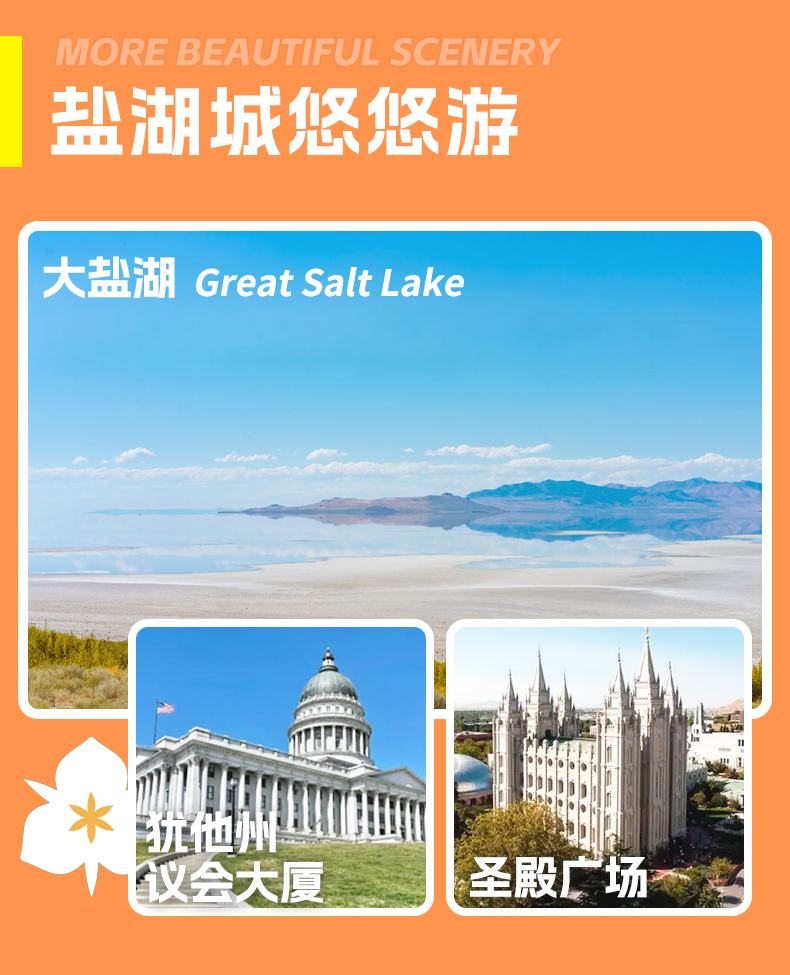 盐湖城 → 犹他州议会大厦(30分钟)→ 圣殿广场(40分钟)→ 盐湖城国际机场(SLC)