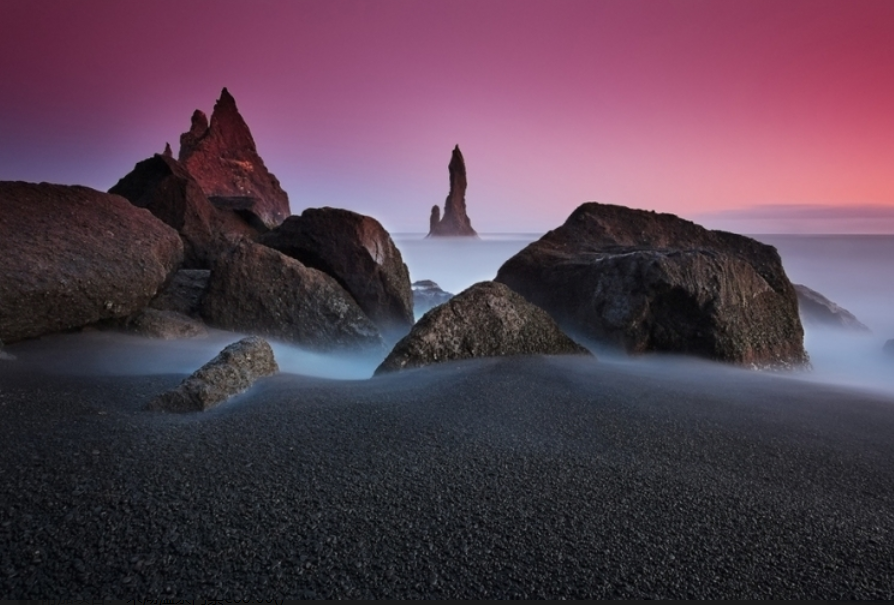 介绍:黑沙滩,其是火山爆发后冷却的黑曜岩被风化后所形成的沙滩。由于它黑得天然,黑 得通透,海水在丝毫未受影响的情形下依然清澈,在阳光下泛着金色的微光。进入黑沙滩有两个入口。其中一个是开到Vik后,从 Reynishverfisvegur转进去,这里可以看到整片的黑沙滩,还有一大排玄武岩组成的石头。