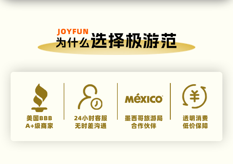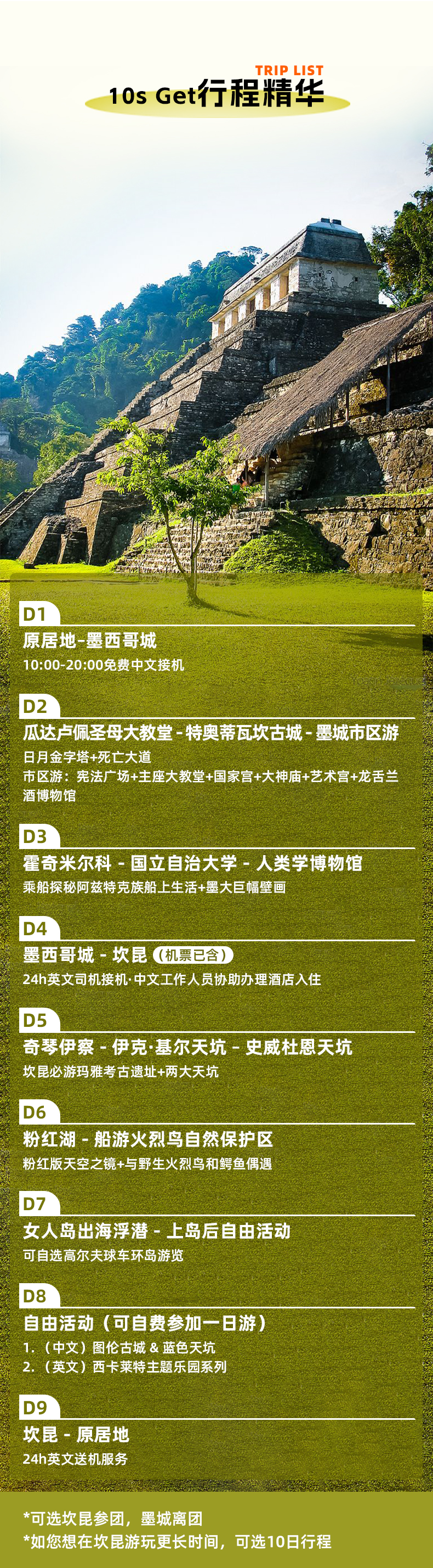 20.该行程需要自行飞往墨西哥当地参团,如您在前往目的地参团过程中被海关遣返或无法入关等其他问题。行程无任何退费,请知悉。