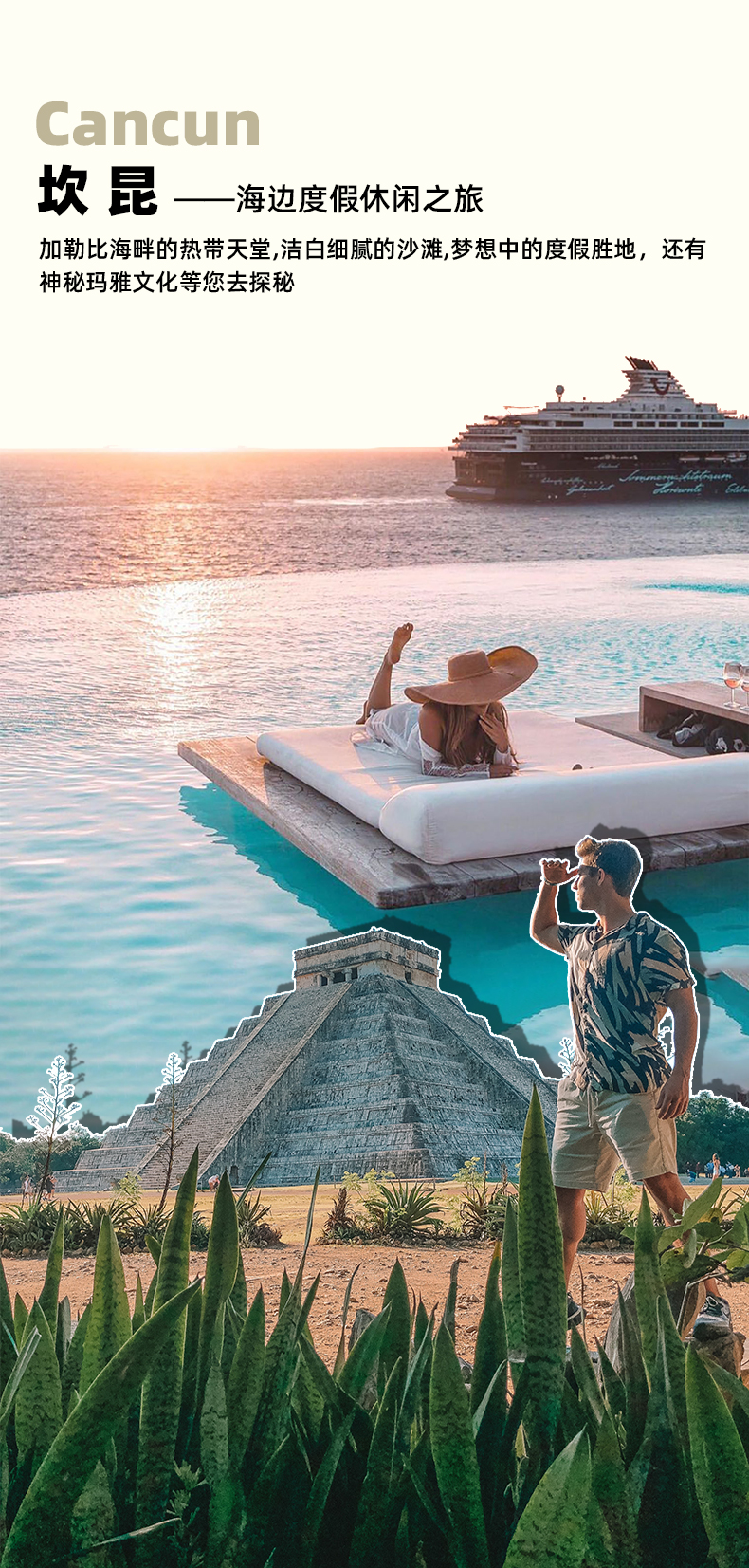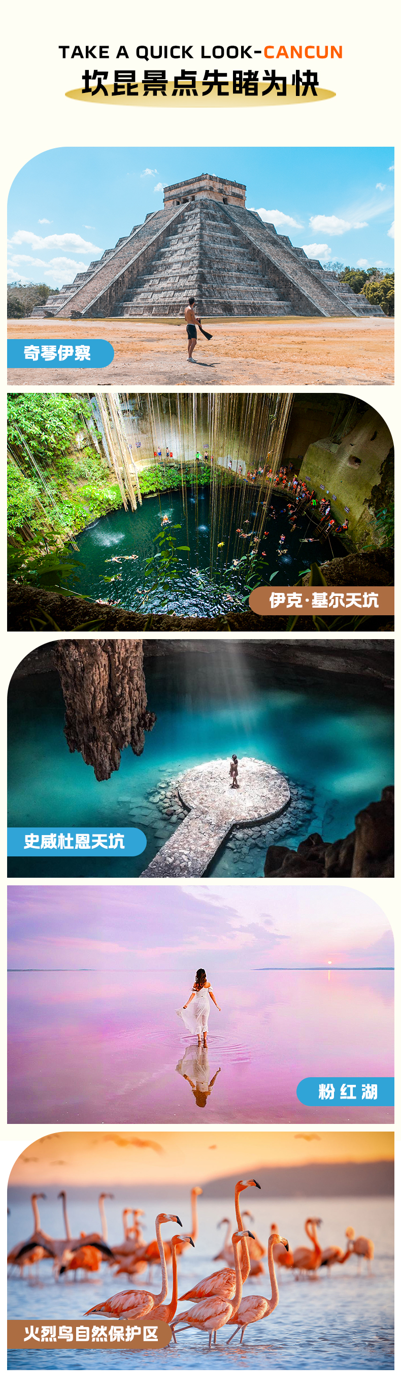 5. 交通:墨西哥城 – 坎昆单程机票,如行程倒走含坎昆 – 墨西哥城 的单程机票(机票不含托运行李,如需托运行李可自行付费购买)