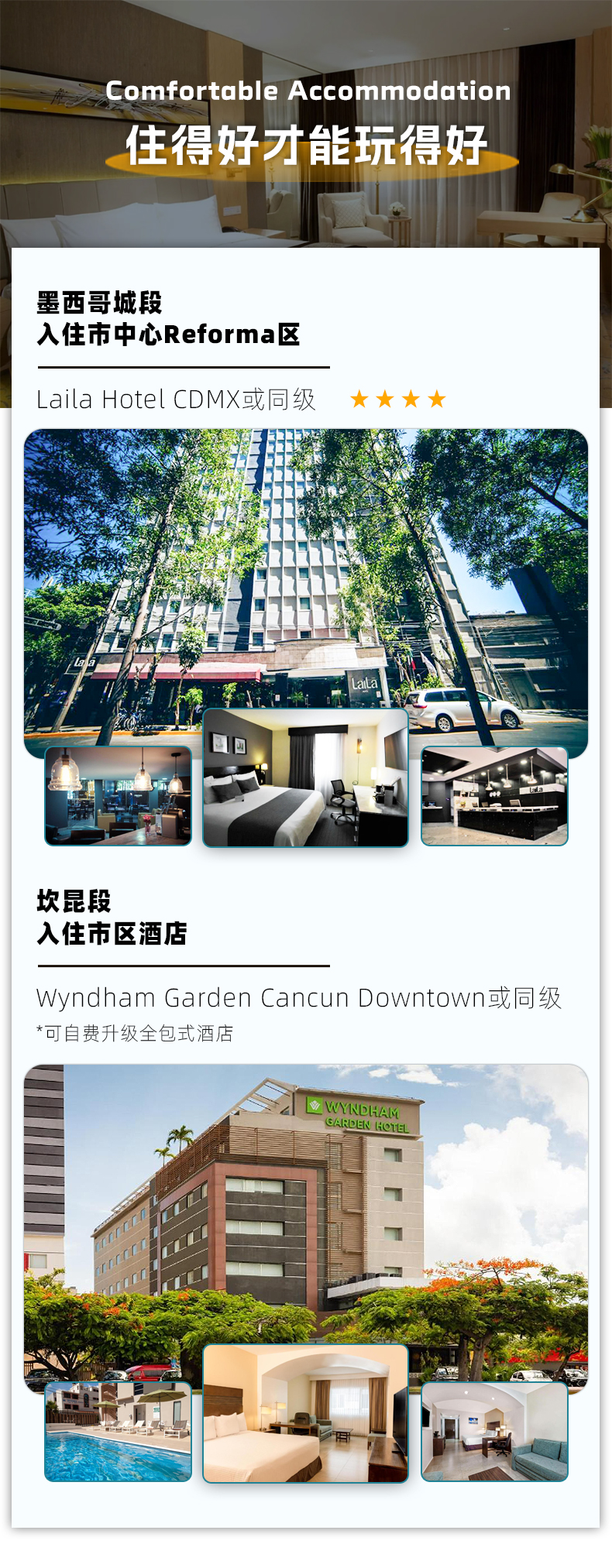 | 坎昆段 | 坎昆市区酒店 Wyndham Garden Cancun Downtown或同级(含早餐) | 坎昆市区酒店 Aloft Cancun或同级(含早餐) |