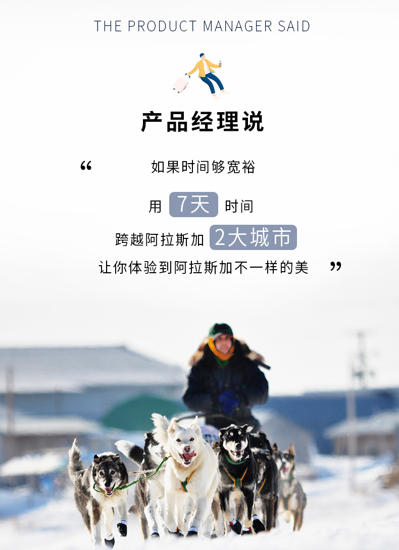 3.如果您全程 加定 北极圈行程 或 迪纳利国家公园徒步(二选一)+ 2项雪地活动,请预定最后一天7:00之后离开的航班。