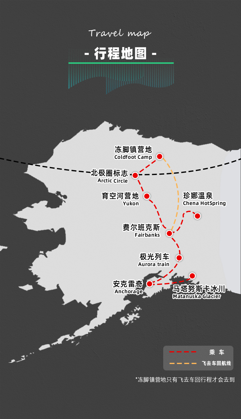 2.如果您全程只参加 北极圈行程 或 迪纳利国家公园徒步,请预定最后一天7:00之后离开的航班。