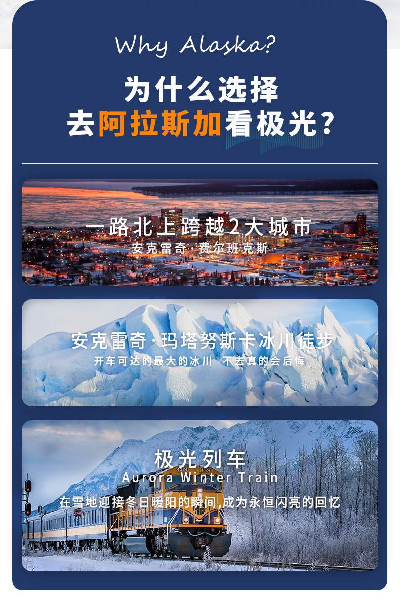 拥有 10 万人口的阿拉斯加州第二大城市费尔班克斯(Fairbanks),是深入阿拉斯加内陆和北极圈探险的交通枢纽中心。费尔班克斯是全球观赏北极光的胜地,一年之中有超过 243 天的清晰夜空可以观看到北极光景象,由于仅距离北极圈 310 公里,并靠着山脉的屏障,费尔班克斯可以避免恶劣天气,也因此北极光的追寻者们都会聚集在这个最易观测到北极光的城市。亦有很多新婚夫妇,因古老的传说“看见极光就会幸福一辈子”而选择此地作为蜜月度假的目的地。导游会用专业拍摄设备为您记录极光下的美好瞬间,同时也会为您提供拍照方面对技巧以及参数设置等方面的技术支持。