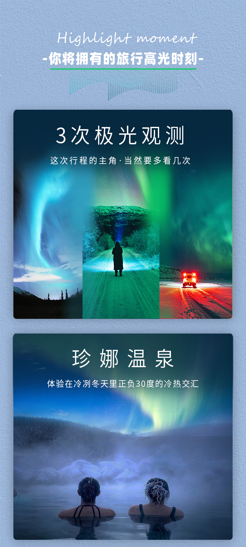 20.极光属于自然景观,因为北极光受到大自然天气影响不定时出现,我们不保证100%看到北极光。