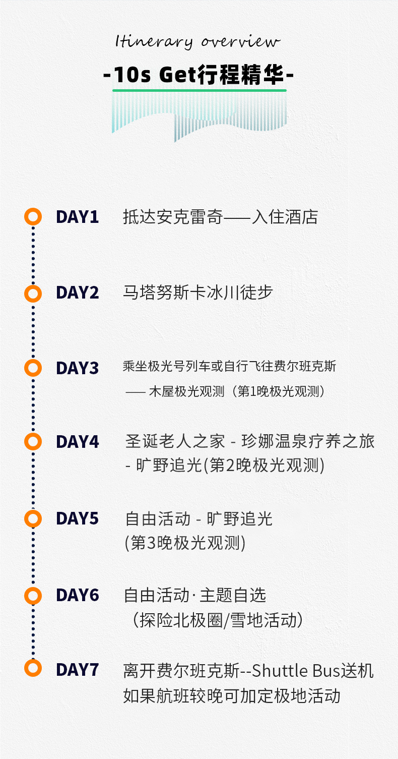 *如航班抵达时间较晚,无法赶上第1晚追极光,无退款无补偿,请预订合适的航班。