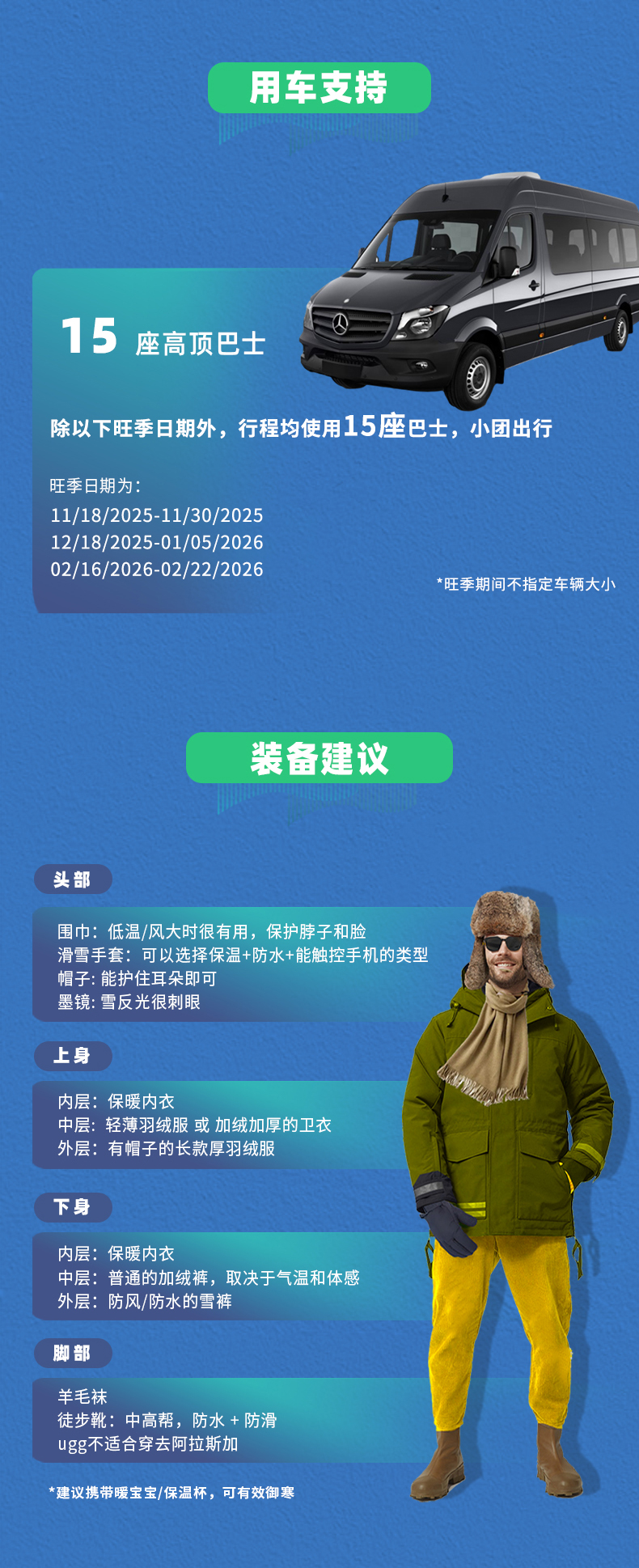 旺季时间:11/18/2025-11/30/2025,12/18/2025-01/05/2026,02/16/2026-02/22/2026