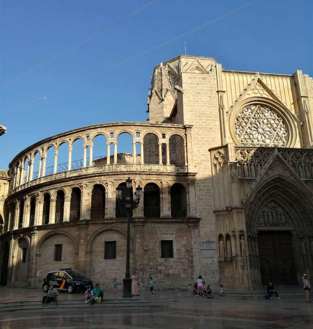 华伦西亚大教堂于1262年以传统的哥特式风格开始修建,它坐落于后来改为清真寺的膜拜月神蒂安娜的罗马神殿旧址上。面向萨拉格萨广场的西侧是巴洛克风格,而南门是罗马风格。这座建筑的核心是至今尚未完成的15世纪八角钟楼,被称为米格雷特(Micalet)。