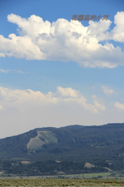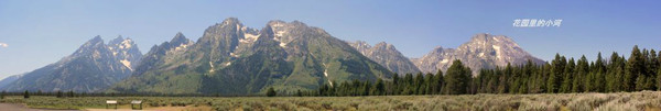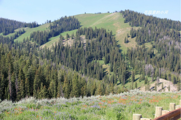这是大提顿国家公园里的景致。大提顿是黄石公园南边的另一个国家公园。山势险峻、雄伟。这一处林木错落有致,鲜花盛开,令人憧憬。(山上没有树木的地方恐怕是雪崩造成。)