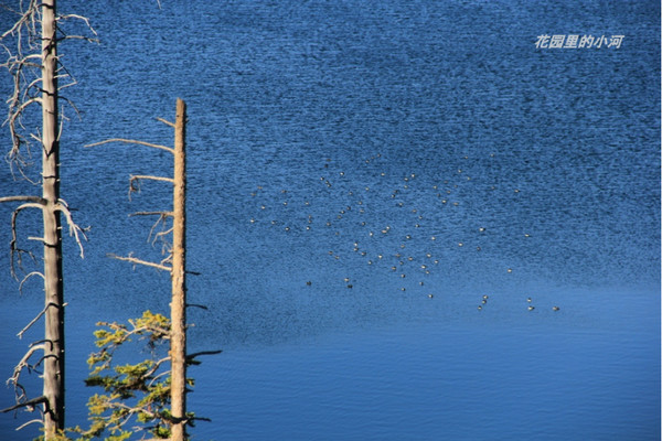 这就是唯一的一张黄石湖的照片。湖水象一块蓝色的天鹅绒,水鸟映斜阳,闪闪发光,非常奇特。别具一格。