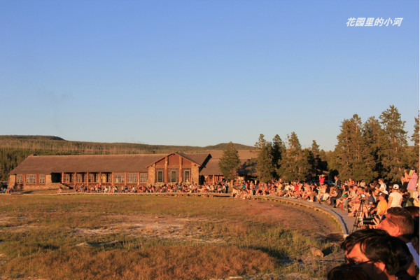 夕阳下等候“老忠实”(闻名遐迩的间歇泉)的人们。“老忠实”基本上每90分钟喷发一次。人们总是准时在长凳上耐心等待,象是等候一位名演员的出场。