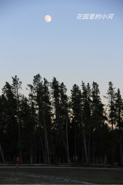 看完“老忠实”,一转身,一轮明月不知什么时候爬上树梢,挂在天空。啊!多么圆满的一天!