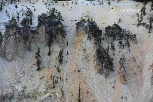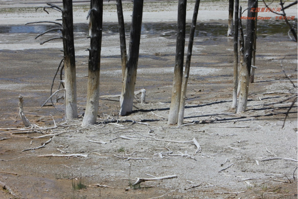黄石的各种地热特征,象喷泉、间歇泉、温泉、泥潭。。。。集中在公园的西南侧。这些树不是因火而是因水而亡。它们近温泉而生。温泉水含有大量的钙。水多的时候泉水漫到这里,树根先亡,但树皮继续吸收钙,就成了这个样子。如果把树锯断,里面和别的树没有区别。