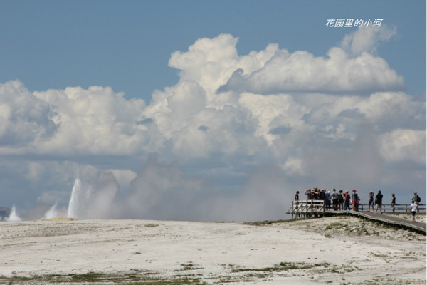 终于等来了。“老忠实”每次爆发之前总要先小喷一会儿,象是集结一些力量。可是人们总是激动地端起相机,咔咔咔。每次爆发能喷出14,000 – 32,000升的开水;高度达32到56米;时间长达一分半到五分钟。爆发和爆发之间光冒热气。