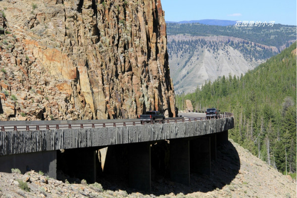 这是黄石的金门桥。两侧异峰突起,万丈千仞;迎面百尺高崖,咄咄逼人。车行其上,微微有些颤动。举头仰望,岩石嶙峋,寒气逼人。绕过这个弯儿,层峦叠嶂,道道秀峰尽现眼前。一派大好河山。此生不枉矣。