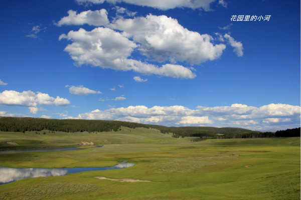 蓝天白云、青山绿水。词藻在美妙的大自然面前是多余的。象这样一边是绿树、一边是绿草的山岗并列着一道又一道,抑扬顿挫,犹如仙境。美极了!
